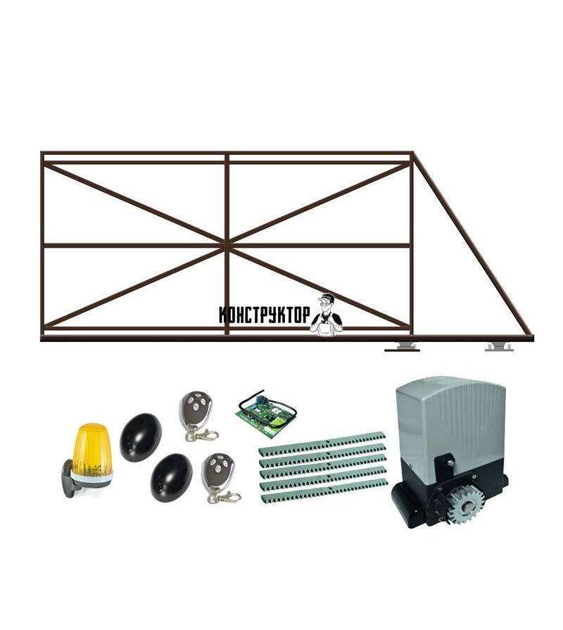 Базовая комплектация электропривода: привод, приёмник, пульт, зубчатая рейка, фотоэлементы, сигнальная лампа.