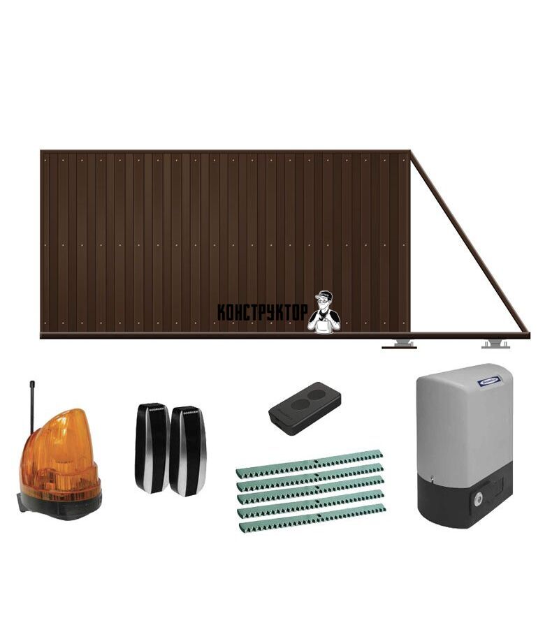 Базовая комплектация электропривода: привод, приёмник, пульт, зубчатая рейка, фотоэлементы, сигнальная лампа.