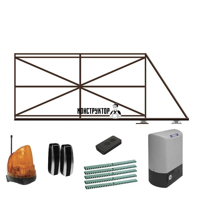 Базовая комплектация электропривода: привод, приёмник, пульт, зубчатая рейка, фотоэлементы, сигнальная лампа.