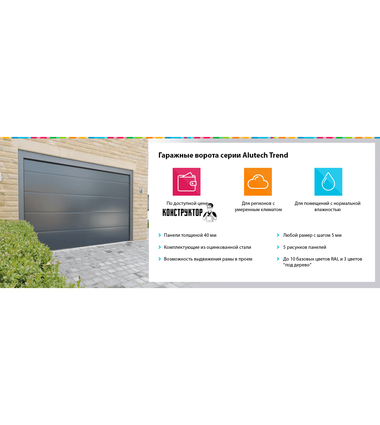 Особенности ворот Alutech серии TREND: -панели толщиной 45 мм.; -комплектующие из оцинкованной стали; -возможность выдвижения рамы в проем; -торсионные пружины с ресурсом 25 000 циклов; -изготовление любого размера ворот с шагом 5 мм.; -5 рисунков панелей; -до 10 базовых цветов RAL и 3 цветов "под дерево" Современный дизайн, функциональность и привлекательная цена - лишь немногие преимущества, которыми обладают ворота Алютех Тренд. Линейка отличается удобством монтажа, а также имеет ряд отличительных особенностей, выгодно выделяющих ее на фоне остальных продуктов бренда. Замкнутый контур стальных листов Стальные листы, из которых состоят сэндвич-панели, соединяются системой, не допускающей расслоения панели под постоянным воздействием тепла, что неизбежно случилось бы при длительном нахождении ворот весь день находятся на солнце. Соединение листов выполняется в четыре слоя сверху и снизу с использованием саморезов, что гарантирует отсутствие провисаний и перекосов. Благодаря этому даже при монтаже оборудования темной окраски замкнутый контур обеспечит долговечность изделия при его эксплуатации. Защита от защемления пальцев Серия TREND соответствует стандарту безопасности EN 12604, который исключает возможность защемления пальцев. Любе положение секций не допускает травмирования их элементами. Надежное сцепление стальных листов с утепляющей пеной Использование прослойки из адгезионного лака позволяет достичь надежного сцепления стали с пеной. Даже под воздействием температуры наличие прослойки вероятность вздутия полотна или деформации панели равна нулю. Защита от коррозии Применение цинкового покрытия, а также наличие вспомогательного слоя грунтовки обеспечивает надежную защиту от разрушительного действия коррозии. Долговечное покрытие Для наружного покрытия панелей используются специальные полиуретановые красители, включающие полиамидные частицы. Такая краска не только сохраняет воротам их первозданный вид, но и увеличивает их резистентность коррозии и механическим поврежденям. Хорошая теплоизоляция К-т сопротивления теплоотдачи для оборудования серии TREND составляет 0,74 м? °C/Bт. Для сравнения - аналогичным параметром обладает кирпичная стена, имеющая толщину 55 см.